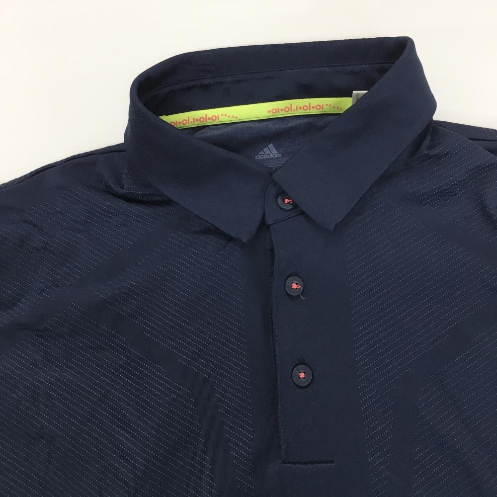 【美品】アディダス 半袖ポロシャツ ネイビー 地模様 裾ラインイエロー メンズ O(XL) ゴルフウェア adidas