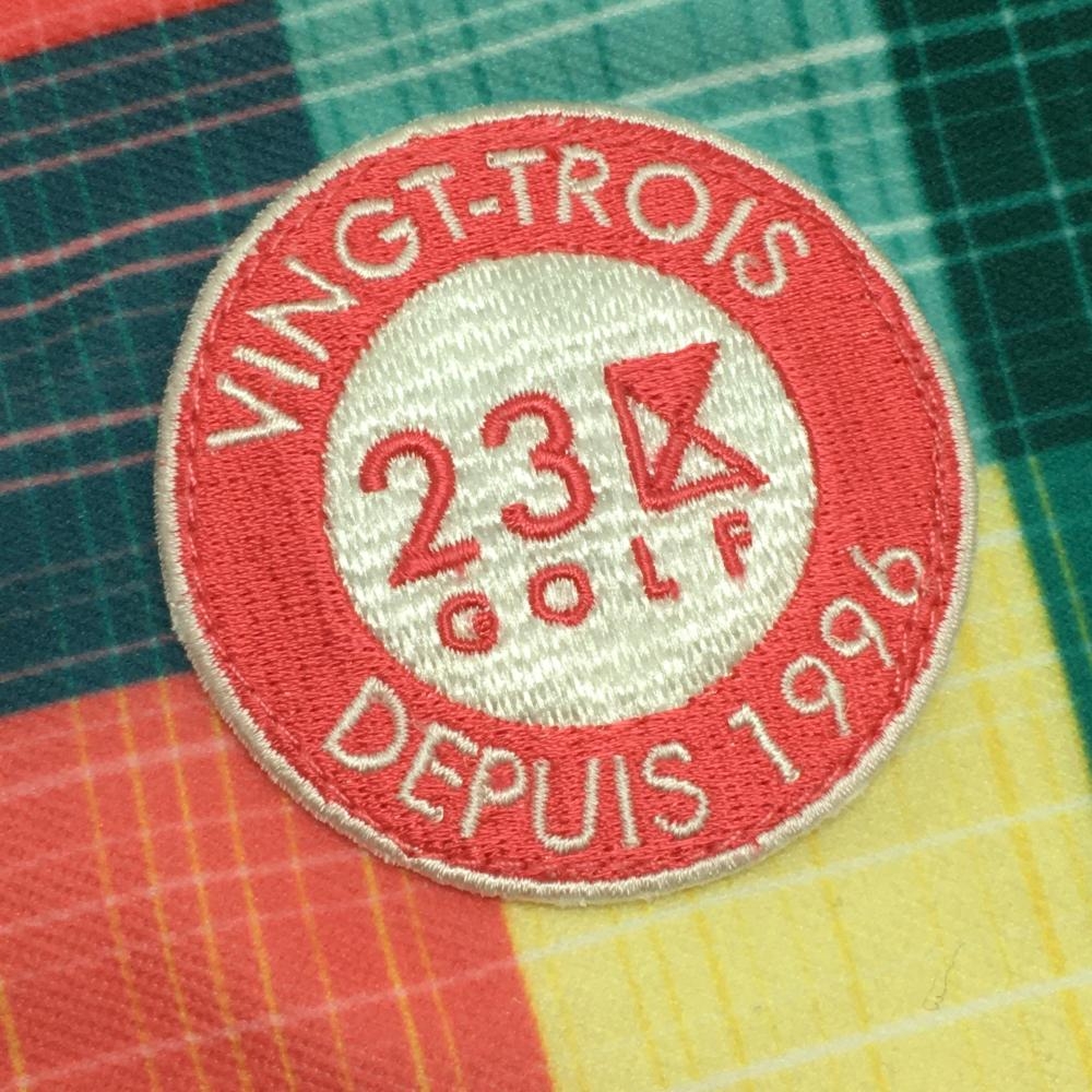 【超美品】23区ゴルフ 半袖ポロシャツ レッド×イエロー×グリーン チェック ワッペン レディース I(M) ゴルフウェア 23区