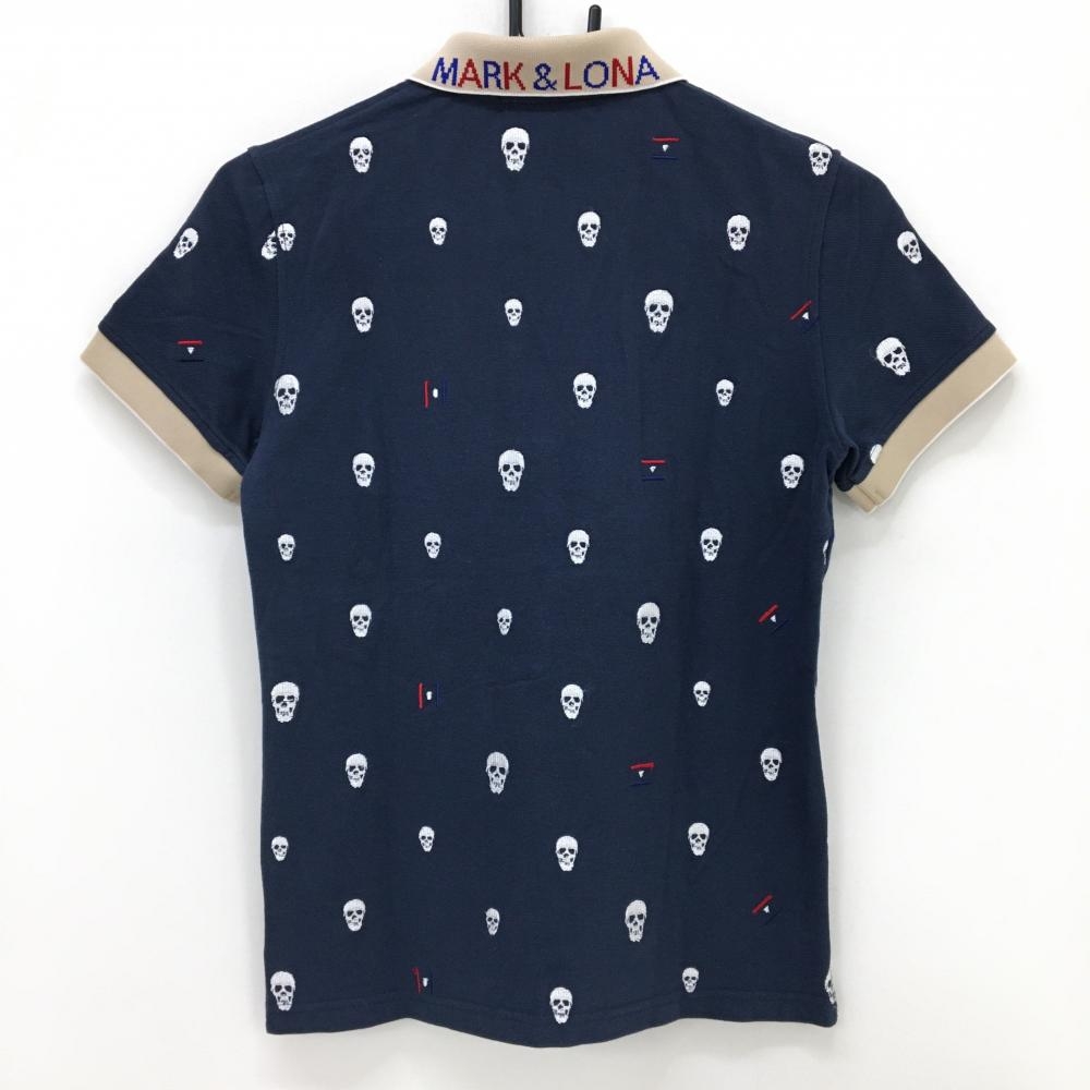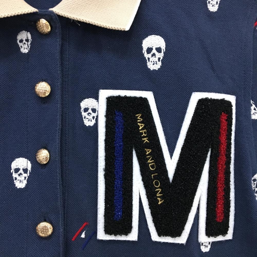 マークアンドロナ 半袖ポロシャツ ネイビー×白 スカル刺しゅう総柄 レディース S ゴルフウェア MARK&LONA