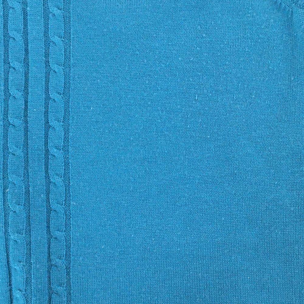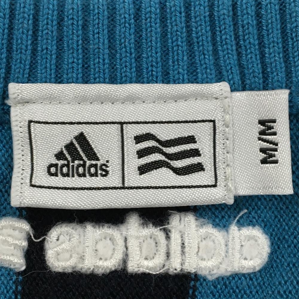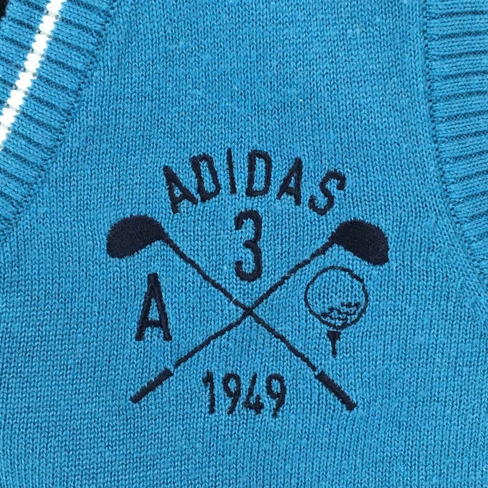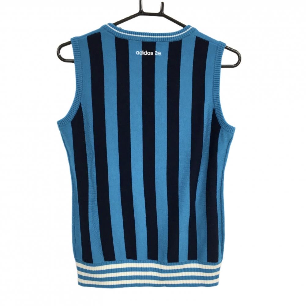 【美品】アディダス ニットベスト ブルー系×黒 フロントケーブル編み 背面ストライプ ロゴ刺しゅう レディース M/M ゴルフウェア adidas