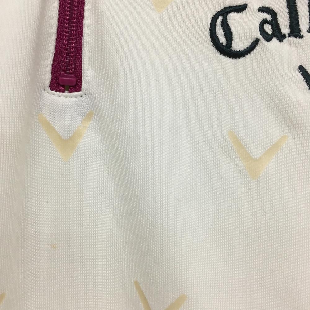 キャロウェイ 長袖ハイネックシャツ 白×ベージュ ロゴ総柄 裏微起毛 ハーフジップ ストレッチ レディース M ゴルフウェア Callaway